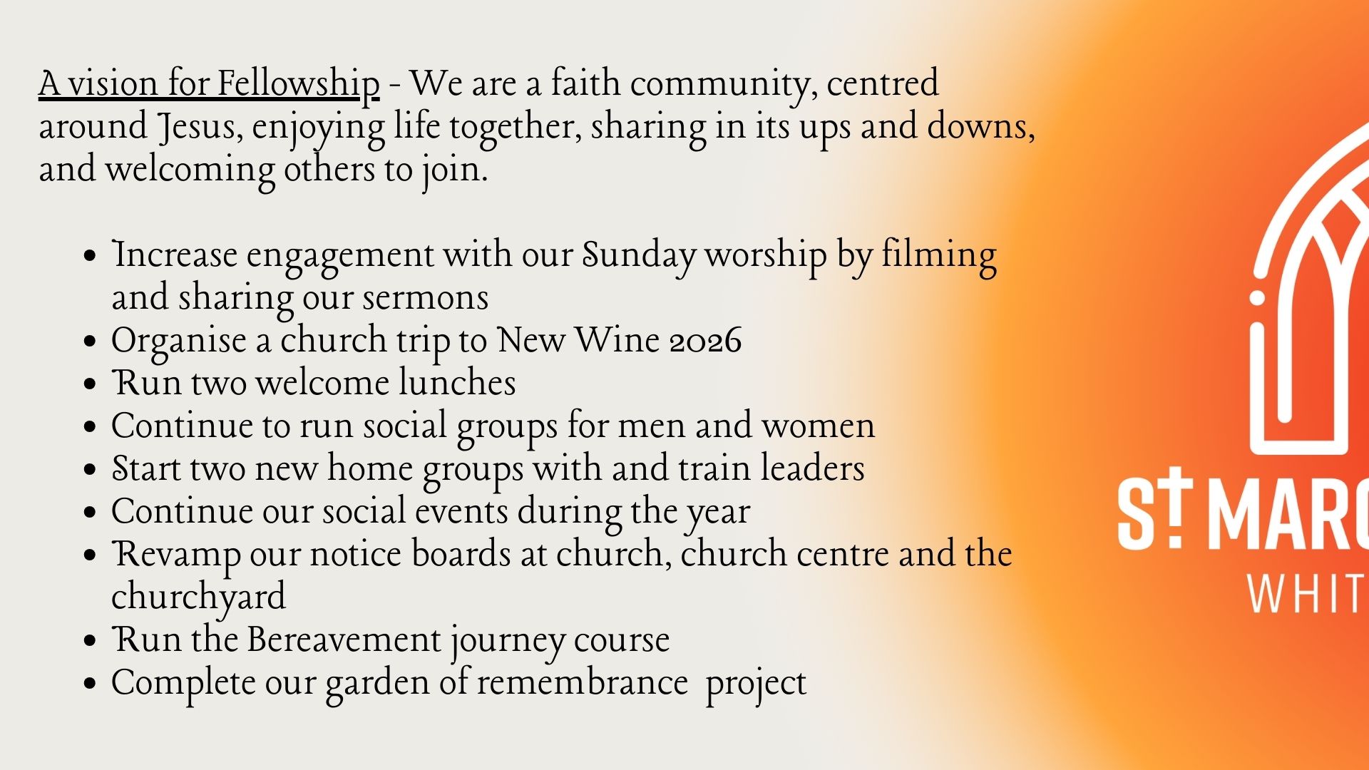 In July 2025 our PCC spent time praying and reflecting on what we think God wants us to be focusing on for the next 12 months and beyond. As a result we produced an exciting new action plan. This is a document that reflects our passion for people to come to know Jesus Christ and how we can join in with what God is already doing in our local communities. The vision is split into 4 sections: worship, discipleship, fellowship and evangelism. These sections are directly influenced by the early church in Acts chapter 2: 42-47: