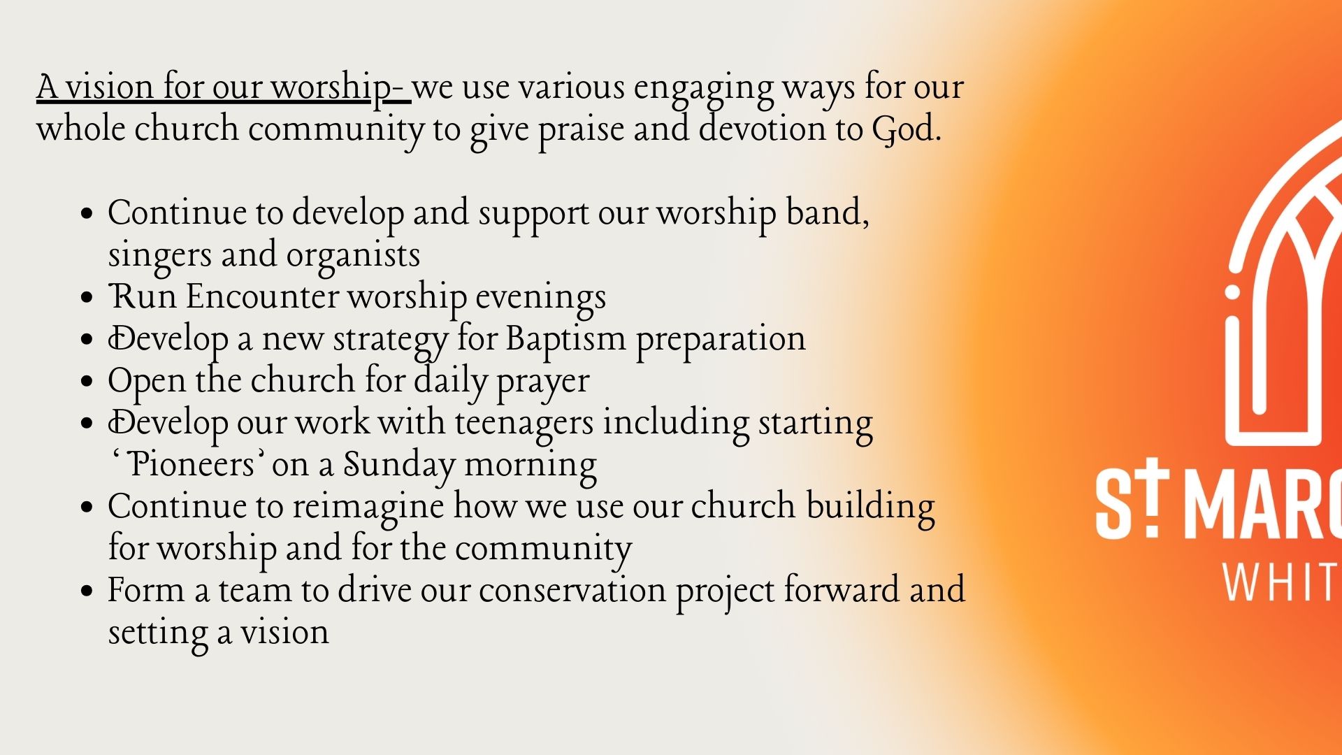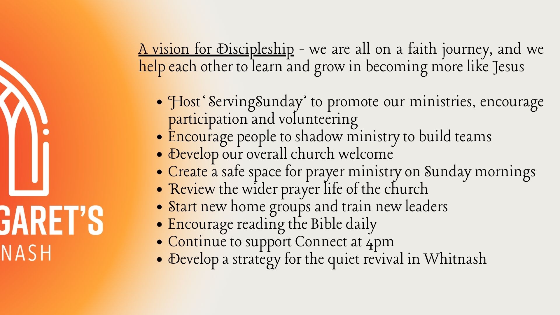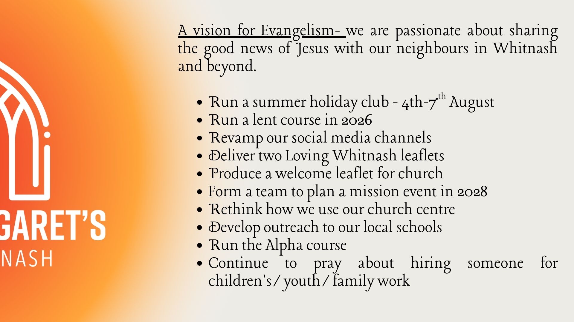 You can find the plan above and I urge you to take a prayerful look. I am asking the congregation at St Margaret’s to consider where they think God might be calling them to share their gifts to make this vision happen. Some of the goals are very achievable, in fact we are well on the way to completing quite a few of them! However, some of them are more aspirational and may not happen this year, but we are passionate that these goals will help St Margaret’s to grow in faith and in number.