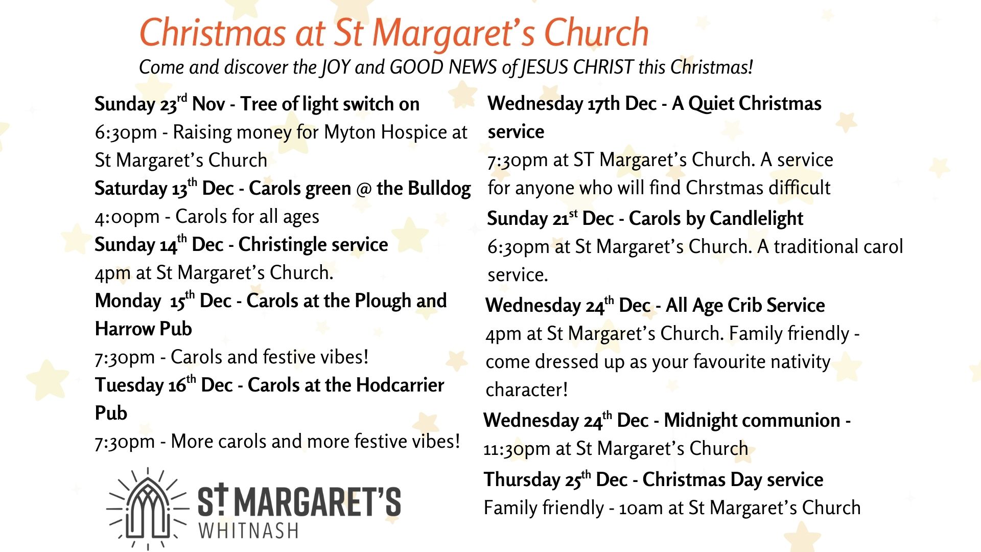 I wonder what you think of when you see the word Joy? Perhaps memories of childhood, or the now distant memory of your summer holiday? We are living through a time of great upheaval, stress and anxiety and if you watch the news like I do - Joy isn’t the first word I would use to describe our current times. But, there is hope to be found in the story of Christmas. The birth of Jesus is good news for all of us. Jesus promises to bring us life to the full, and through his death and resurrection we can experience true joy, even in these times.Come and join us at St Margaret’s to discover the joy that can be found in a relationship with Jesus and in a growing church community!